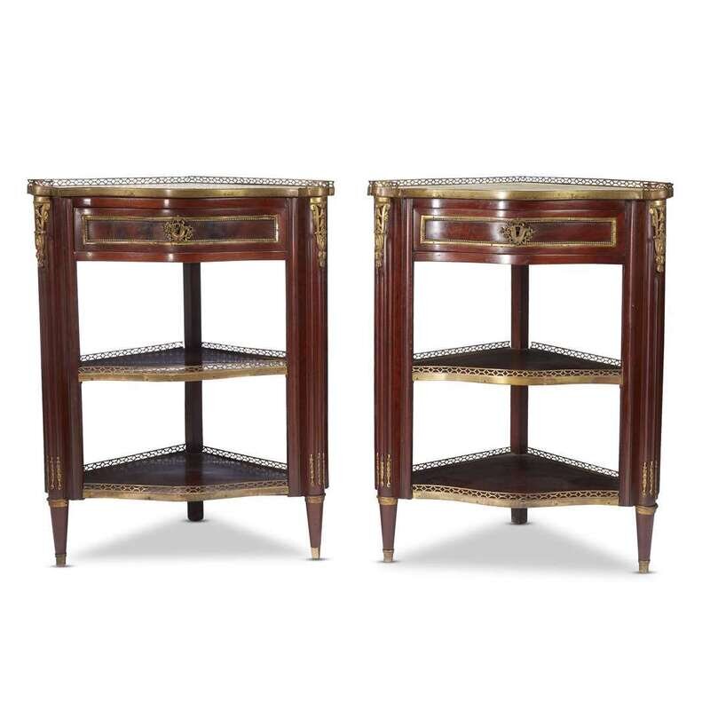 A pair of Louis XVI style brass-mounted mahogany serpentine étagères-encoignures 19th century