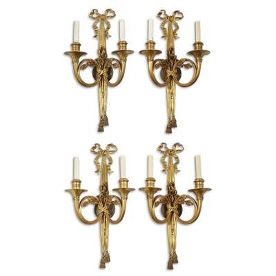 Four Louis XVI style gilt-brass two-light wall sconces possibly Vian, 19th century