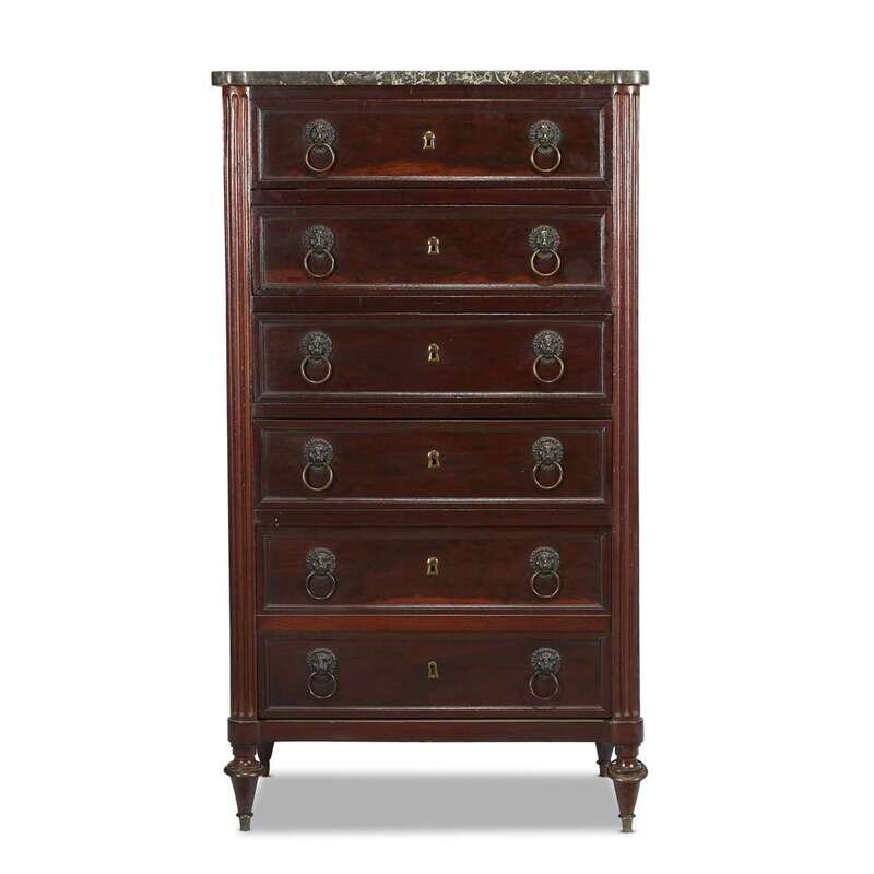 With gris Sainte-Anne marble top above six drawers flanked by fluted columns, raised on toupie feet.