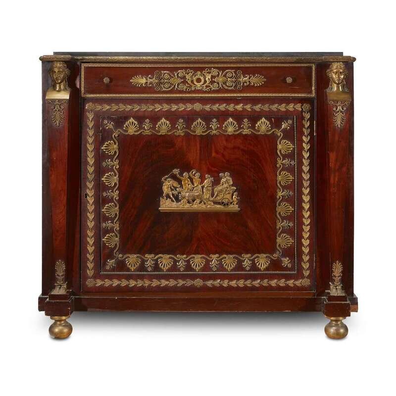 Likely after the model by François-Honoré-Georges Jacob-Desmalter (French, 1770-1841), the rectangular top supported by two caryatid pilasters flanking a frieze drawer over single cabinet door banded with anthemia and centered by an applique of Bacchus and consorts in a chariot pulled by leopards, the door enclosing a set of fourteen drawers; the whole raised on ball feet.
