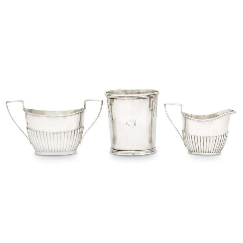 Comprising a creamer and sugar; sold together with an Irish sterling silver beaker retailed by Bailey & Co., Philadelphia. (3).