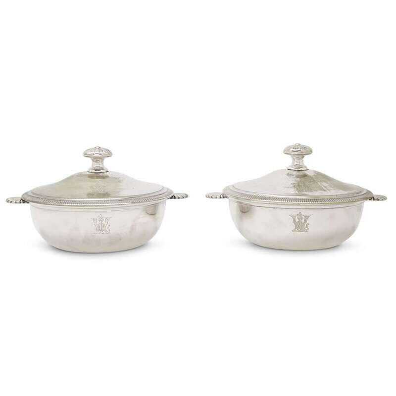 Circular with shell-form handles, the covers with gadrooned edge and circular knop; each dish and cover monogrammed "WL" for William Fielding Lucas, Jr. (2).