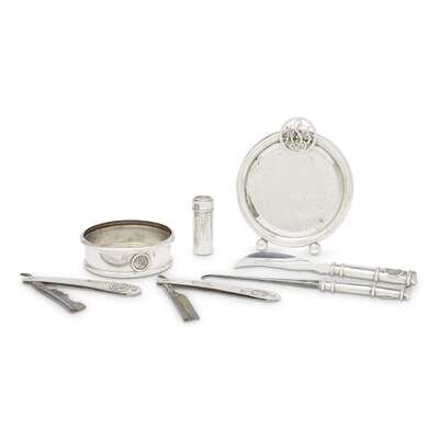 Comprising two straight razors, a circular mirror, a shoe horn, a button hook, a coaster, and a dentifrice phial, all with embossed monogram "WFL" for William Fielding Lucas, Jr. (7).