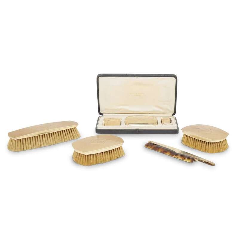 Comprising a gold-mounted clothes brush, a pair of gold-mounted military hairbrushes, and a gold-mounted tortoiseshell comb, together with a fitted case with retailer's label containing a gold cardcase, gold cigarette case, and rose gold vesta case, all monogrammed "WFL" for William Fielding Lucas, Jr., each piece marked 14k. (7).