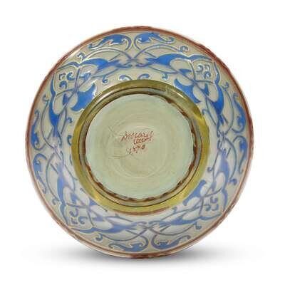 Compressed baluster form with flared rim, the body decorated with parcel-gilt blue enamel arabesques; the lip, waist, and foot with red and white parcel-gilt strapwork bands; signed and dated on base.
