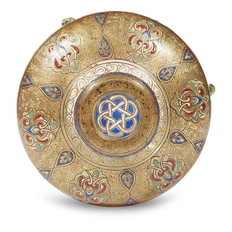 The compressed conical body with exaggerated flared rim, the neck enameled with Thuluth script calligraphy above a double parcel-gilt foliate band, the body with three applied loop handles segmenting a band of blue ground with vacant Thuluth script calligraphy against a blue enamel ground, the underside decorated with alternating polychrome-filled reserves against a parcel-gilt ground of arabesques.