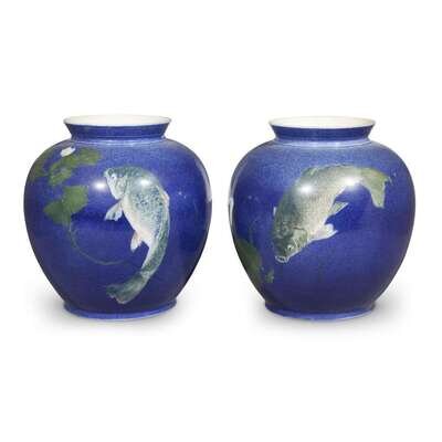 Of rounded form with flared lip and foot, each decorated with carp and waterlilies on a stippled blue-glazed ground; the bases with underglaze three wave mark, number "1054.", and artist cypher "l.E.H.", with additional incised numbers "10" and "35." (2).
