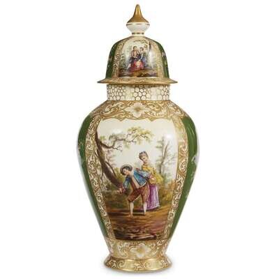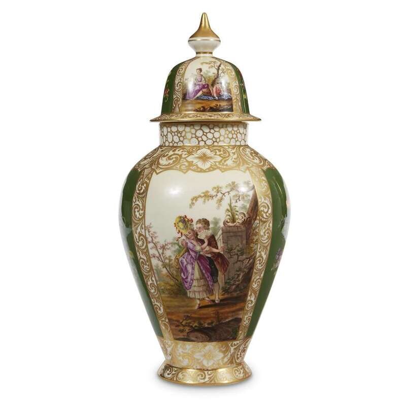 With alternating green and white reserves segmented by parcel-gilt scrollwork, the green reserves decorated with floral sprays and the white reserves painted with scenes of courtship; marked to underside with blue underglaze Augustus Rex mark.