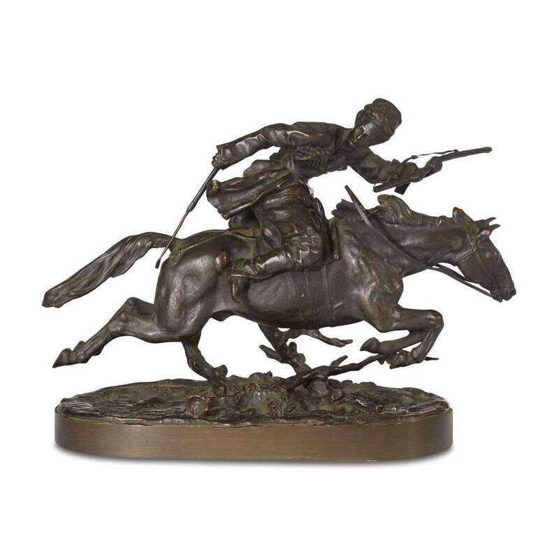 The first, of a galloping cossack signed in cast "Lansere" in cyrillic on base and with foundry mark of F. Shopen, the second of a peasant looking attentively at a figure (now missing) and signed in cast "Lansere" in cyrillic, and with foundry signature in cast "F Chopin" as well as cyrillic foundry mark. (2).