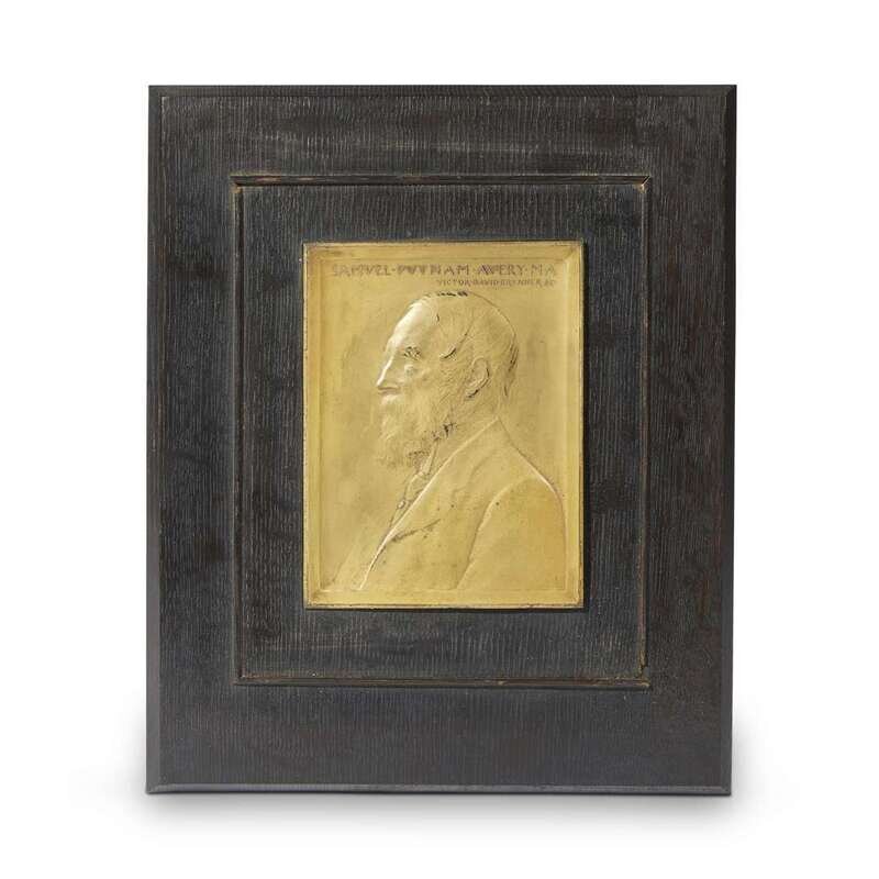 Depicting Avery in sinister profile, titled and signed in cast "SAMUEL PUTNAM AVERY MA/VICTOR DAVID BRENNER SC."; the verso with label: "From W.F. Lucas, Jr. 221 E. Baltimore St., Baltimore, Maryland."