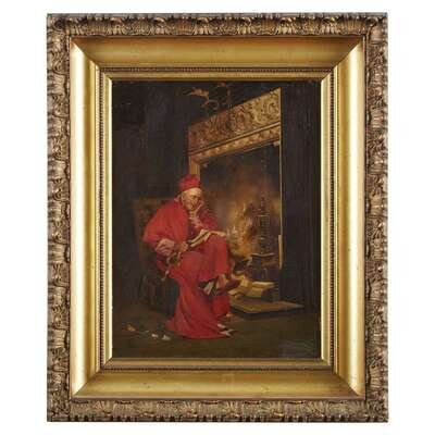 LEO HERMANN (FRENCH 1853-1927) SEATED CARDINAL BY THE FIREPLACE