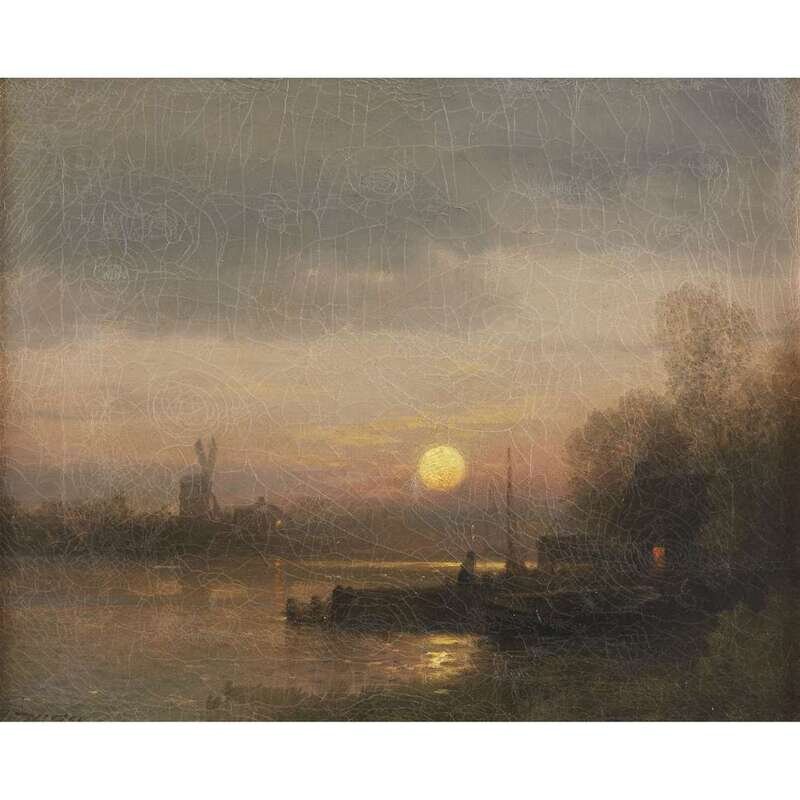 HERMANN HERZOG (AMERICAN/GERMAN, 1832–1932) "SUNSET ON A HOLLAND CANAL"