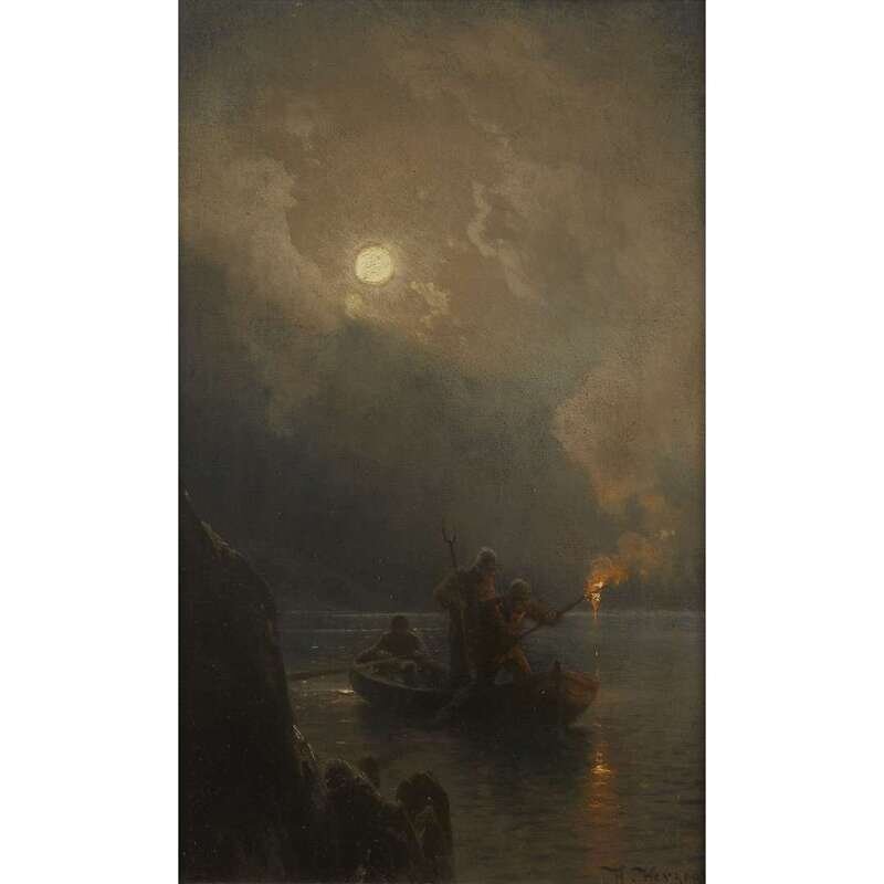 HERMANN HERZOG (AMERICAN/GERMAN 1832–1932) "FISHING FOR SALMON BY MOONLIGHT"