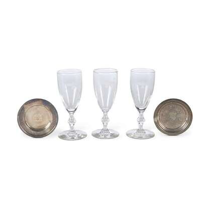 A group of three American President Lines cordial glasses and two miniature silverplated butter pats from the United States Lines 20th century