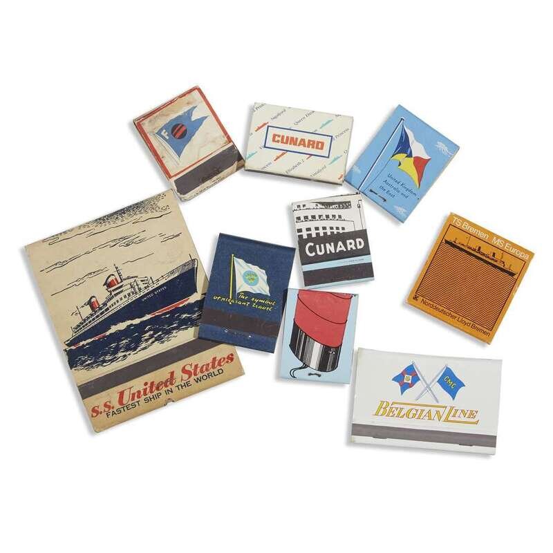 Assorted ephemera from various ocean liner companies. Includes cigarette cards (32), matchbooks (14), matchboxes (4), and empty matchbooks (5). All together approximately 55 pieces.