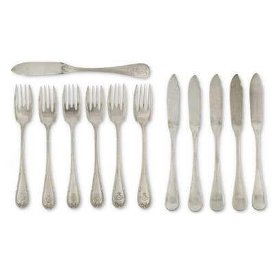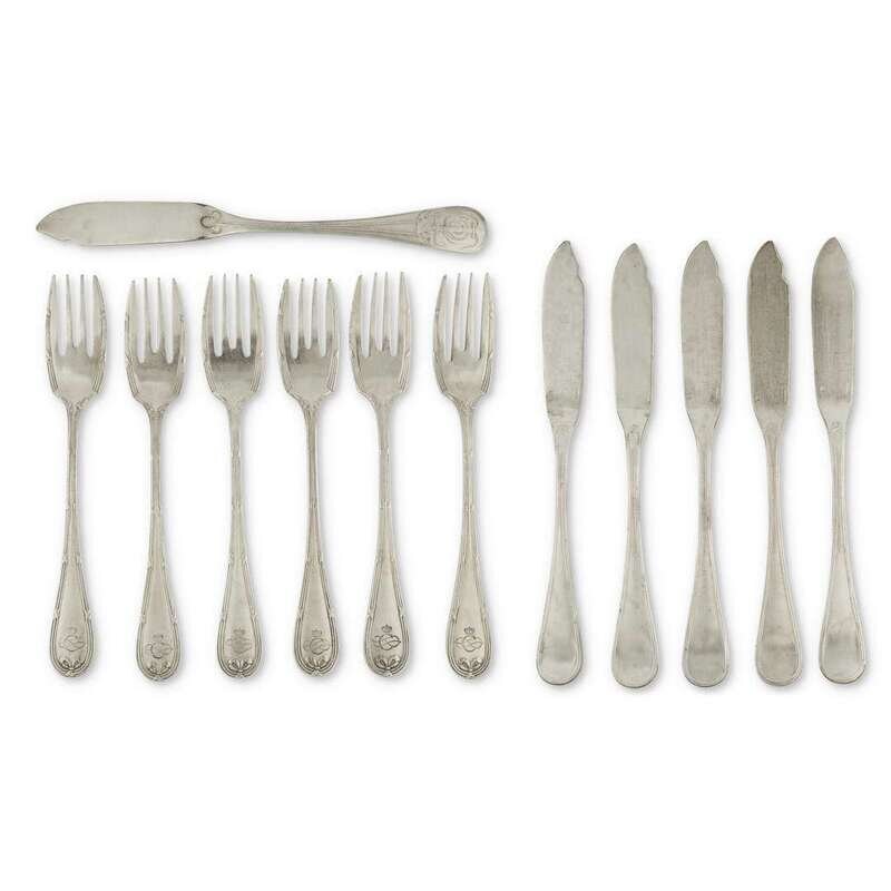 A set of twelve Cosulich Line silverplated fish knives and salad forks christofle and wellner, 20th century