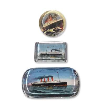 A group of three souvenir glass paperweights from British ocean liners early 20th century
