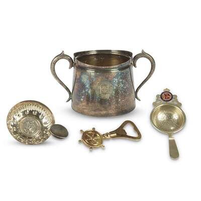 Comprising a two handled silverplated cup from the Straits Steamship Co. Ltd., marked Walker & Hall/Sheffield to underside; a silverplated tastevin from the Compagnie Des Messageries Maritimes, marked Augis Lyon to underside; a silverplated tea strainer from the R.M.S. Queen Mary, marked E.N.P.S. to underside; and a mixed metal bottle opener from the S.S. Orcades, unmarked. (4).