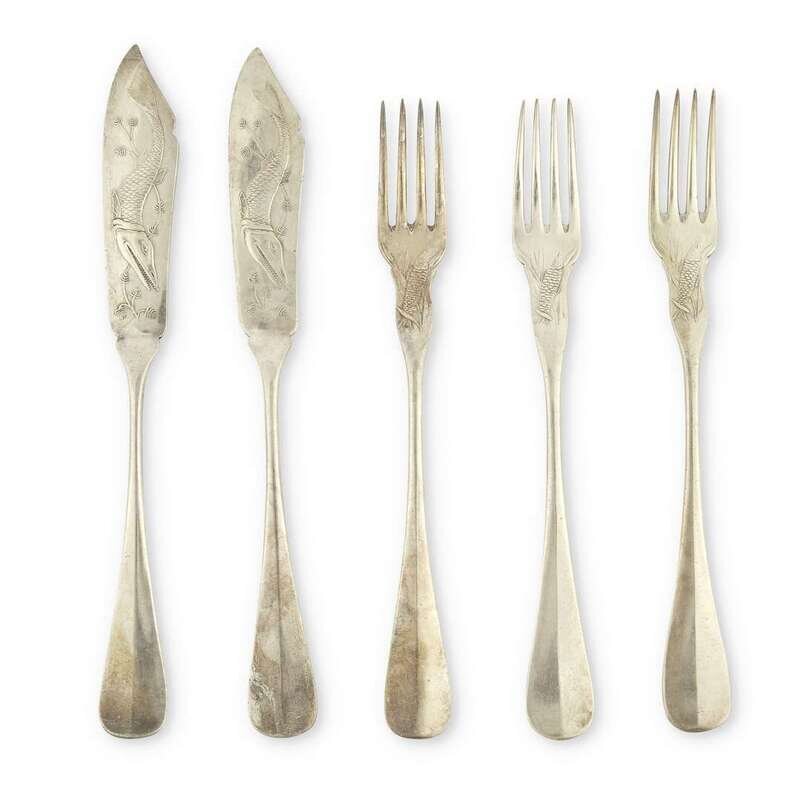 Two silverplated fish knives and three silverplated seafood forks from the Navigazione Libera Triestina hutschenreuter, early 20th century