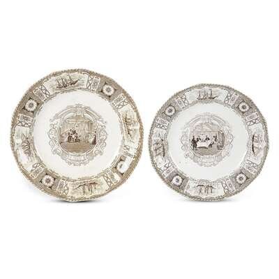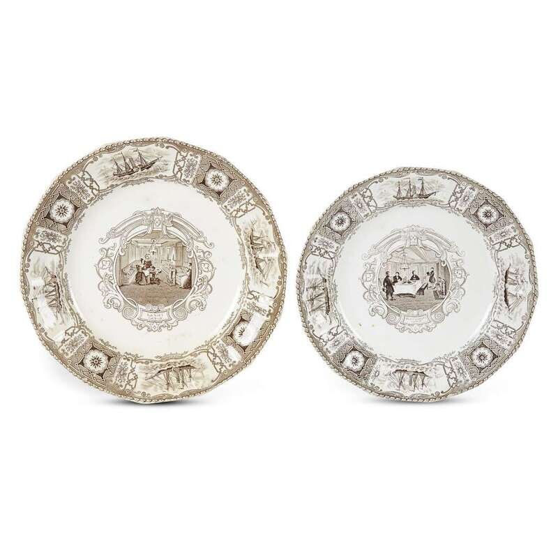 In the brown color scheme, the center of each plate illustrating interior scenes typical of Boston Mails China: the larger plate showing a view of the Ladies Cabin and the smaller plate depicting a view of the Gentlemens Cabin; the edge of each plate with cartouches featuring all four ships in the Cunard Line: Acadia, Columbia, Caledonia, and Britannia; both plates with transferprinted stamps to undersides, the larger plate with the standard "Boston Mails" and ship mark and the smaller plate with the less widely seen mark showing a ship, "Boston Mails," and the inscription "Entered at the Registry Office of Designs Sep. 2nd 1841/J & T Edwards." (2).