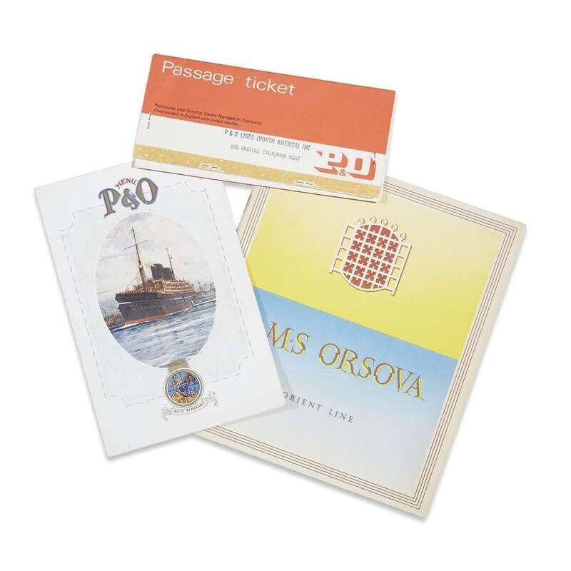 Assorted ephemera relating to the P&O line, including menu cards (26), deck plans (5), a ticket, a sailing schedule, log abstracts (2), assorted advertising materials (5), and books (8). All together approximately 48 pieces.