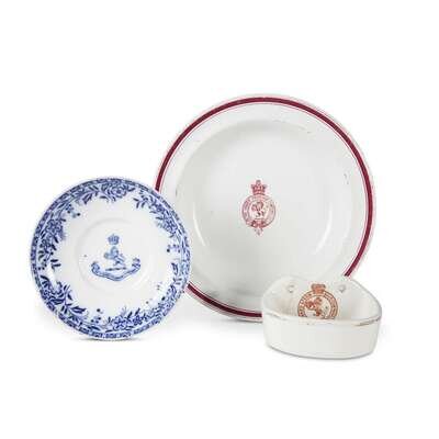 Comprising an ironstone soup plate with logo to well and red rim, marked Davenport, Longport, Staffordshire to underside, circa 1898; an Ormond pattern bread plate with logo to well, marked Mintons to underside along with registered No. 121313, circa 1890; and a rare wall-mounted soap dish with red logo, circa 1900. (3).