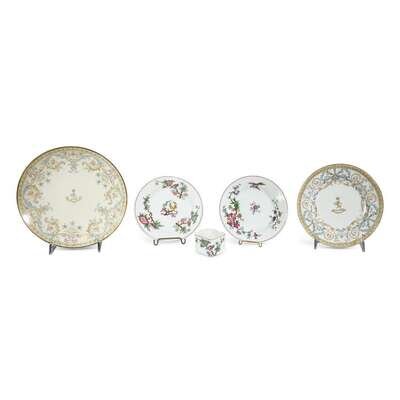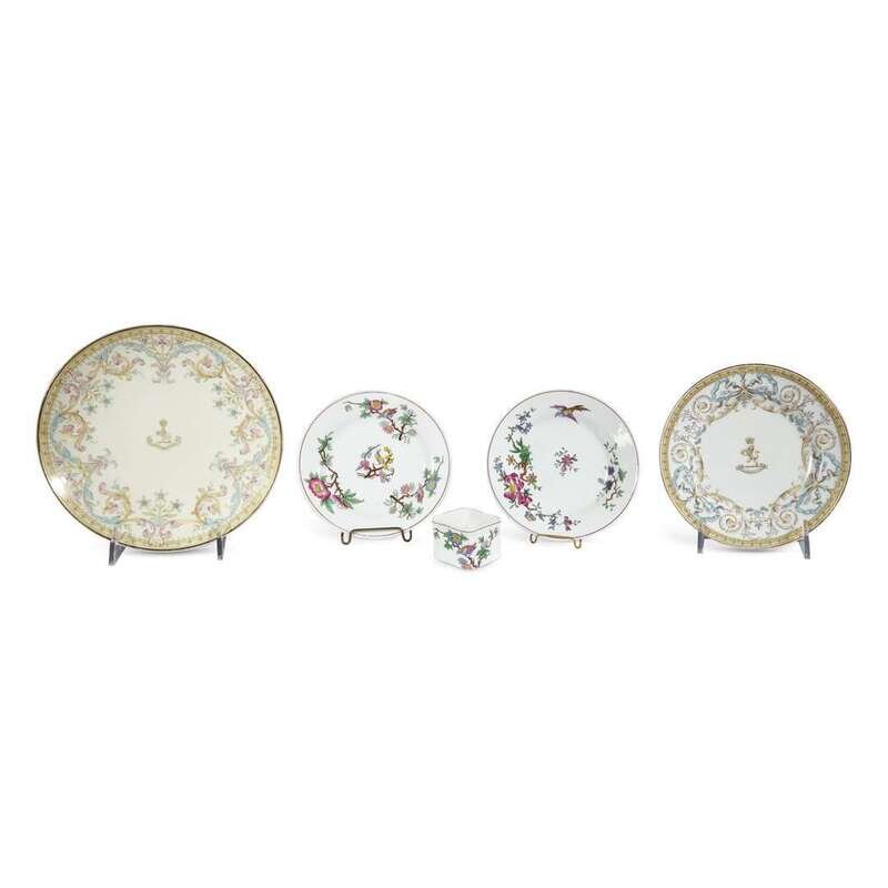 Comprising a dinner plate, circa 1898, marked Minton's to underside; a bread plate, circa 1898, marked Cauldon Ware/T.F. Bennett & Co. Liverpool to underside; a bread plate in the "Currants" pattern, circa 1920, marked Inton China/Reynolds & Son Liverpool to underside; a bread plate in the "Bird of Paradise" pattern, circa 1920, marked Tuscan China/Stonier & Co. Ltd. Liverpool to underside; and a "Cube" butter pat in the "Cuckoo" pattern, circa 1920, marked Minton's to underside. (5).