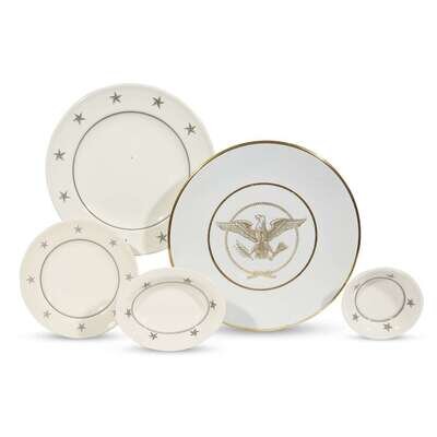 20th century Comprising a charger bearing the gilt eagle and rope motif to center and a group of tablewares with a stars pattern to rim: a dinner plate, a bread plate, and two side dishes. (5).