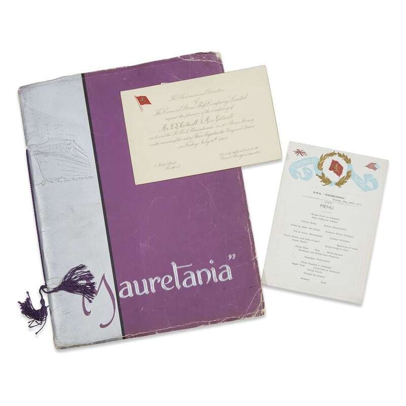 Assorted ephemera relating to the Cunard Line and the Mauretania, including a menu card, invitation ca. 1913, steel engraved plate of an invitation to inspect the Mauretania ca. 1947, advertising brochures (2), books (2), and a program from the July 28, 1938 launch. All together 8 pieces.