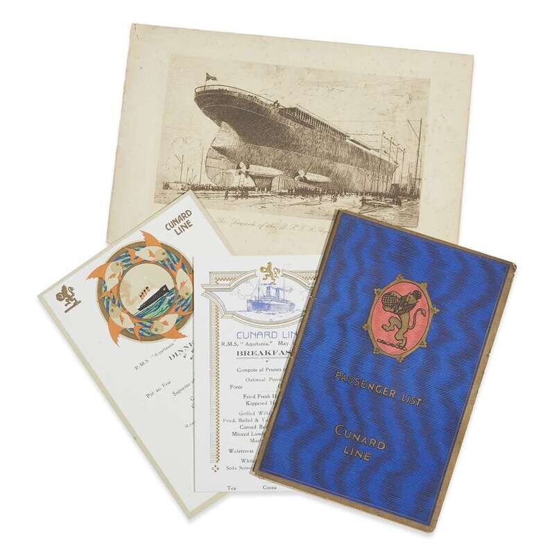 Assorted ephemera relating to the Cunard Line and the Aquitania including, menu cards (4), deck plan, passenger list, photographs, off-set color lithograph, launch invitation for the Aquitania, advertising brochures (3), and two books - one signed and inscribed by the Captain of the Aquitania. All together 14 pieces.