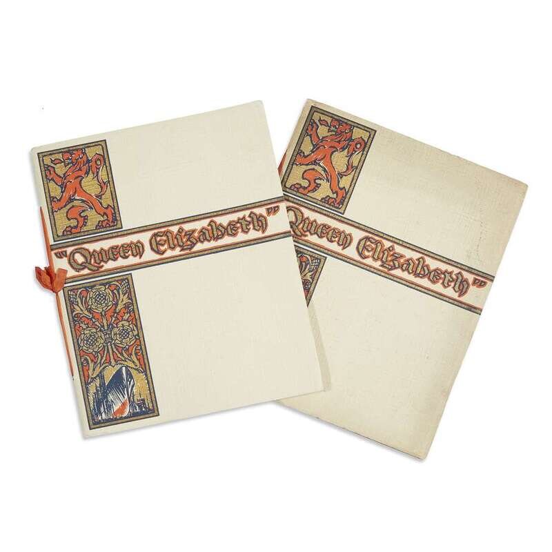 Assorted ephemera relating to the Cunard line and Cunard-White Star Line, particularly the R.M.S. Queen Elizabeth. Items include menu cards (6), accommodation plans (6), an advertising brochure for a Mediterranean Spring Cruise ca. 1929, a passenger list, a ticket, books (3), a press kit, commemorative launch books (2), and assorted newspapers and broadsides printed on board with related ephemera. All together approximately 30 pieces.