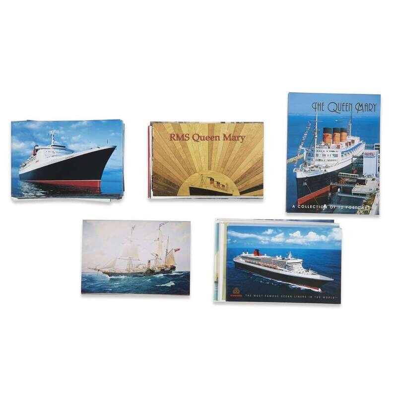 Approximately 120 vintage and modern cards, includes 13 post card format-size chromogenic photos of works of art on the Queen Mary 2, 30 cards showing the Queen Mary at dock in Long Beach, California.