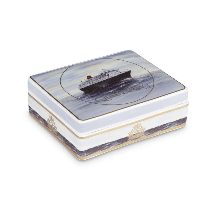 A Cunard Line souvenir covered box from the R.M.S. Queen Mary 2 "Maiden Voyage" vacation international praestigium ltd. for cunard, england
