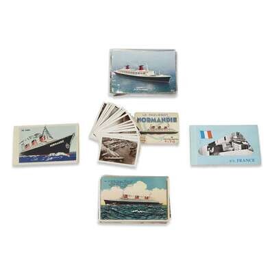 Approximately 87 cards, includes SS Normandy (50 cards - with 20 vues petites in booklet) and SS France (28 cards with 9 in booklet).