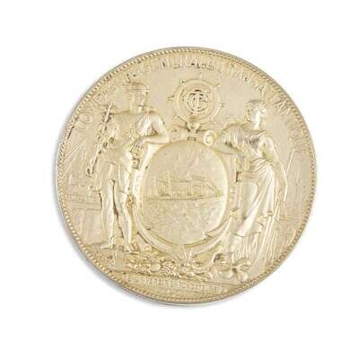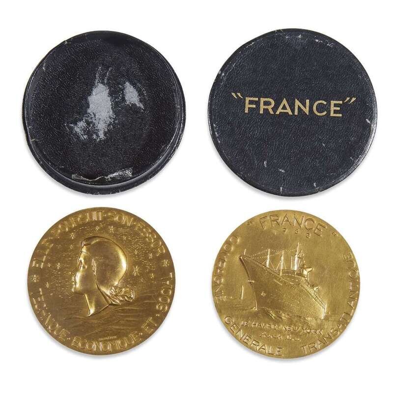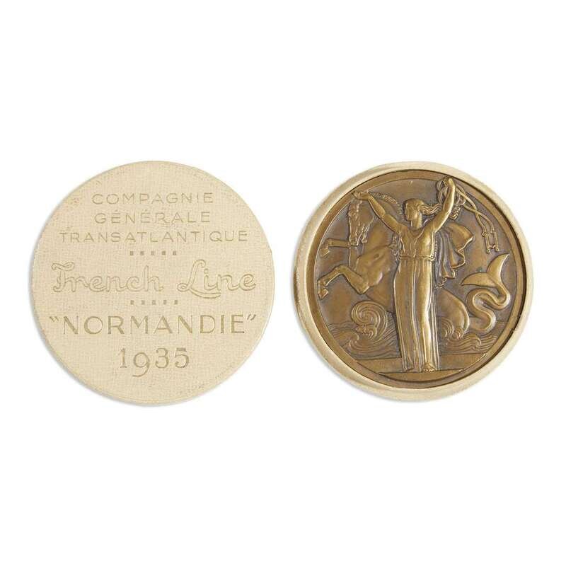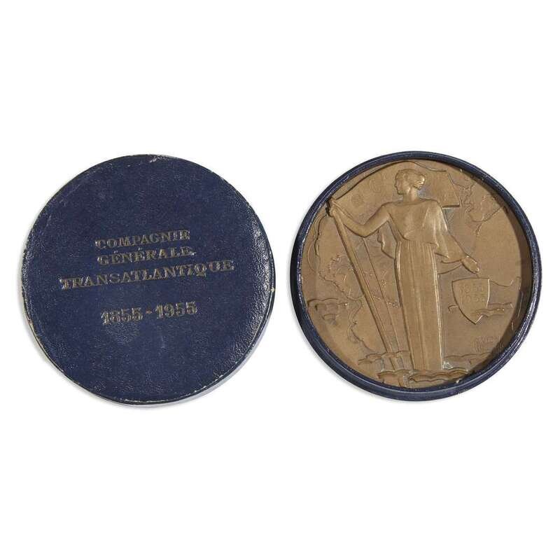 Comprising a medallion commemorating the services of Mr. Claude Blanc, chief engineer of the French Line from 1882-1909; a bronze art deco medallion depicting the S.S. Normandie, designed by Jean Vernon, dated 1935, retaining original box; Normandy; a commemorative medal for the 100th anniversary of the French Line, marked Marcel Renard, dated 1955, retaining original box; and two bronze medallions from the S.S. France, dated 1962, retaining original box. All fine condition. (5).