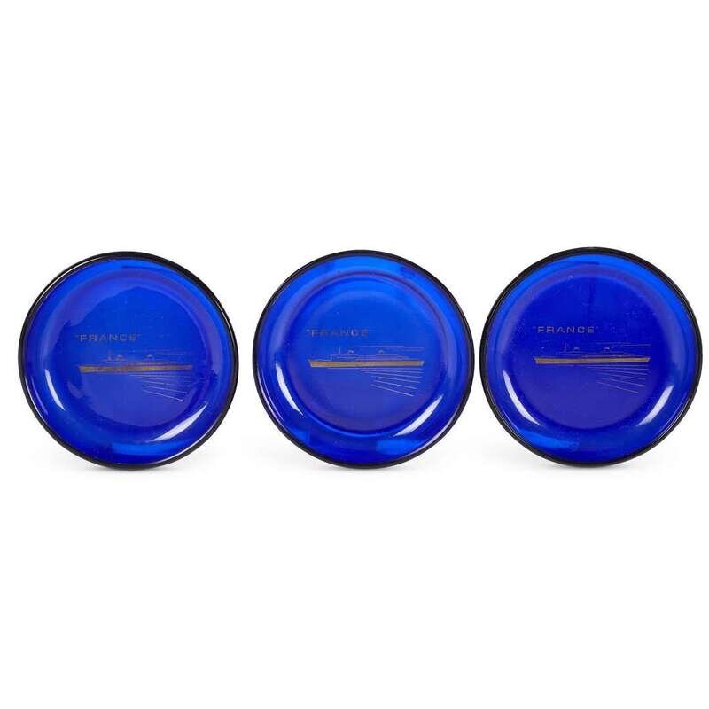 A set of three Compagnie Générale Transatlantique or French Line souvenir blue glass dishes from the S.S. France circa 1960s