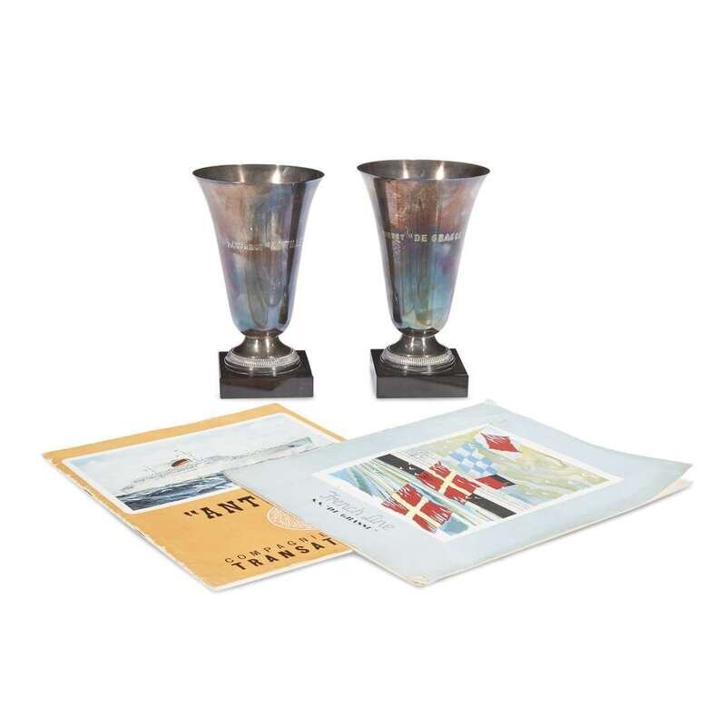 Comprising two silverplated trophy cups, one engraved Paquebot "De Grasse" and the other engraved Paquebot "Antilles"; and two brochures illustrating the accomodations and amenities of the S.S. Antilles and S.S. De Grasse. (4).