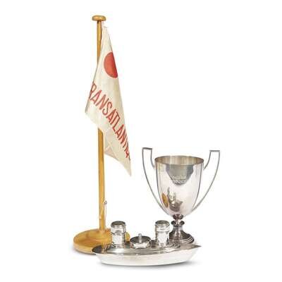Comprising a silverplated trophy cup engraved Paquebot "France", a silverplated condiment holder in the form of a ship from the S.S. Normandie, and a CGT flag on stand. (3).