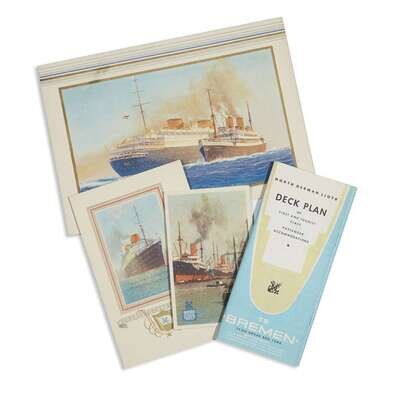 Assorted ephemera related to the German Line, including menu cards (12 - including pre-WWII engraved and colored Bremen menu cards), deck plan, map, etching, prints (2), book, and booklet. All together 19 pieces.