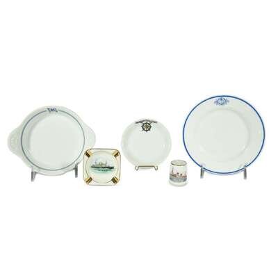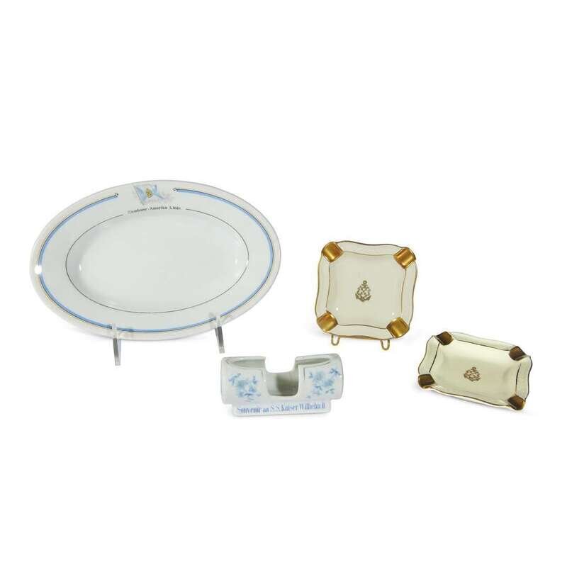 Comprising four items from the Hamburg-American Line or Hamburg-Amerika Linie: two bread plates and two ashtrays; and other assorted wares from German vessels: a casserole dish from North German Lloyd or Norddeutscher Lloyd Bremen, dated 1938; a souvenir knife rest from the S.S. Kaiser Wilhelm II of Norddeutscher Lloyd Bremen; a souvenir dish from the German East Africa Line or Deutsche Ost-Afrika Linie; an ashtray from the MS Berlin; and a miniature souvenir mug from the Pretoria. (9).