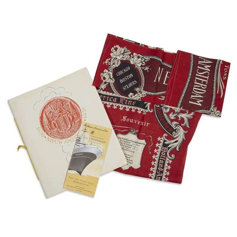 Assorted ephemera relating to the Holland America Line, including menu cards (3), deck plans (5), books and booklets (4), advertising brochures (3), a photograph (1), a cruise plan (1), and early Holland American 1900 sourvenir handkerchiefs (2). All together 19 pieces.