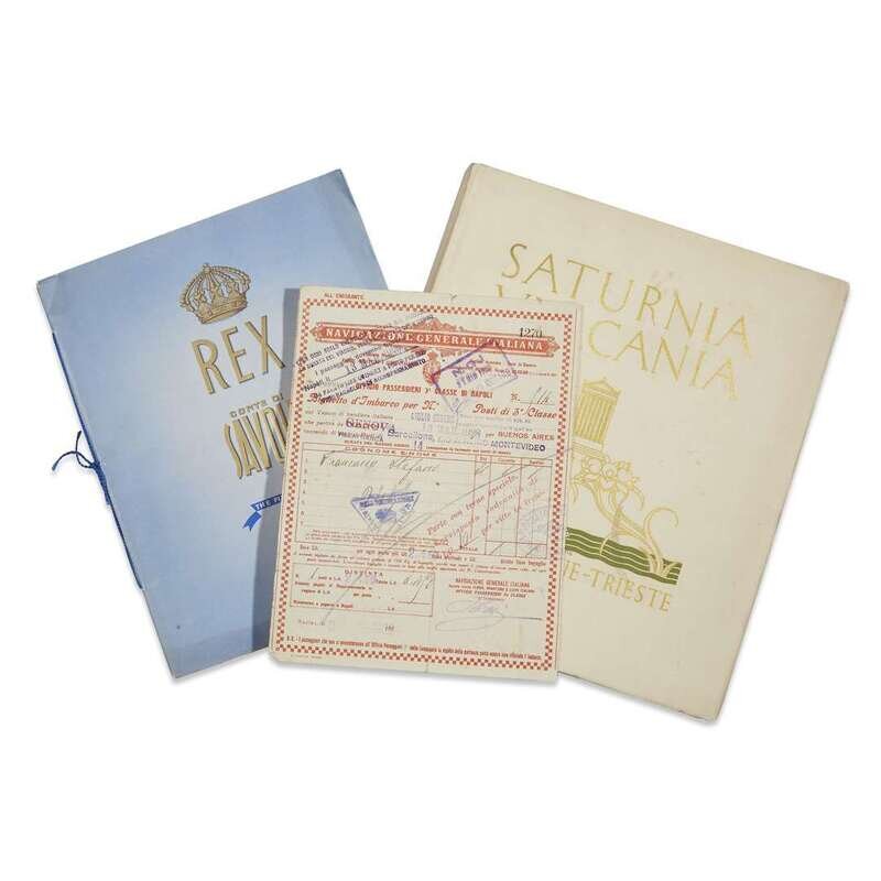 Assorted ephemera relating to the Italian Line, primarily material from the Rex, the Saturnia, and the Volcania, including books (2), menu cards (3), deck plans (2) - including a large folding deck plan for the Saturnia, passenger lists (3), a concert program, a hand-colored albumen photo (late 19th century), a third class ticket to Buenos Aires dated 1928, and a guide for first class passengers on the Rex. All together 14 pieces.