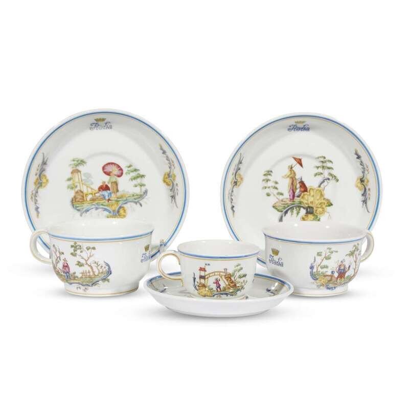 Three Italian Line porcelain cups and saucers from the S.S. Andrea Doria in the chinoiserie taste richard ginori, doccia, italy, circa 1951-1956