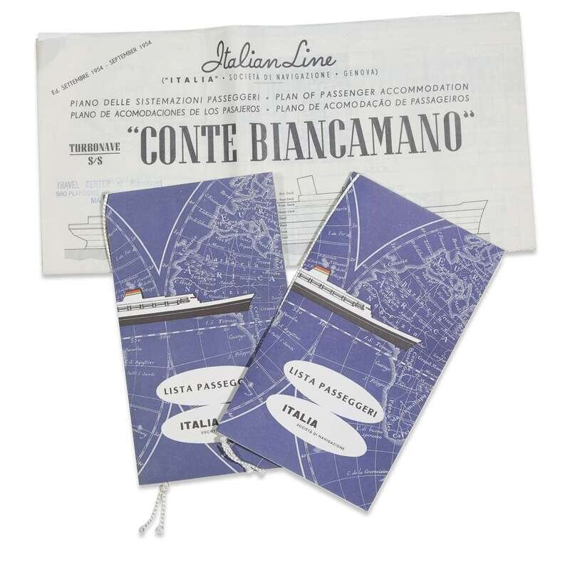 Assorted ephemera relating to the Italian Line, including menu cards (10), deck plans (7), passenger lists (3), a photograph, concert program, sailing schedules (2), and a cocktail party invitation. All together 25 pieces.