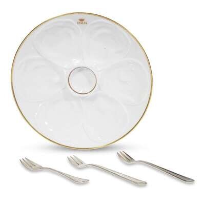 An Italian Line porcelain oyster plate, two Italian Line silverplated oyster forks, and a Cosulich Line silverplated oyster fork various makers, 20th century