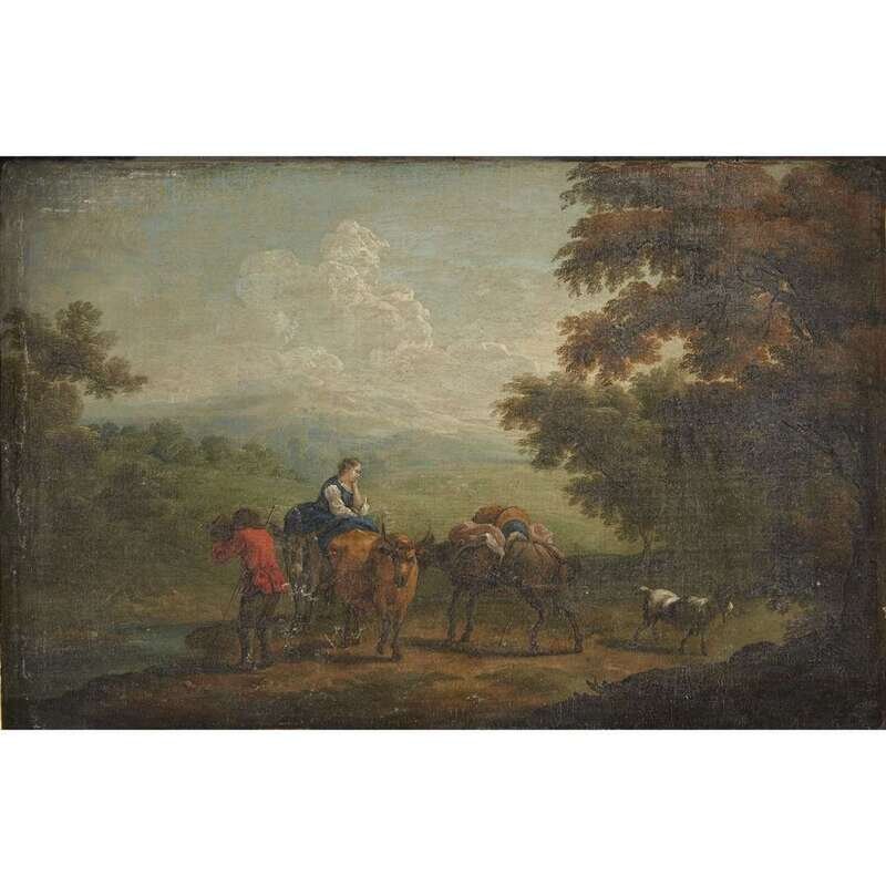 FOLLOWER OF KAREL DUJARDIN (DUTCH 1626-1678) FIGURES WITH THEIR ANIMALS IN A LANDSCAPE