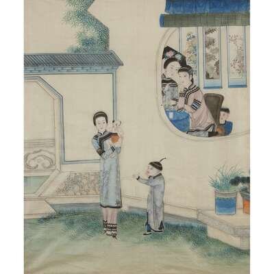 CHINESE SCHOOL LATE QING DYNASTY LADIES AND CHILDREN IN A GARDEN PAVILION
