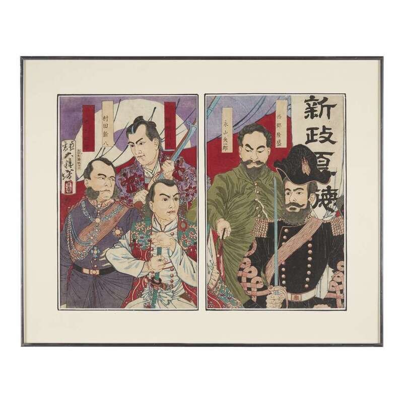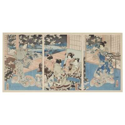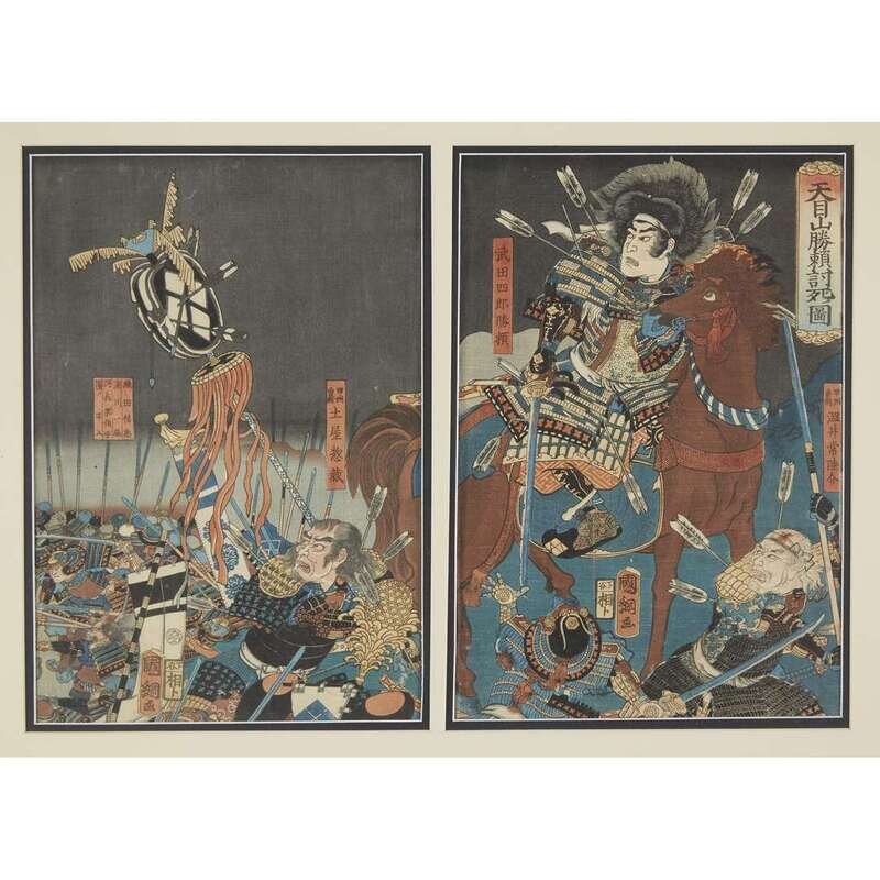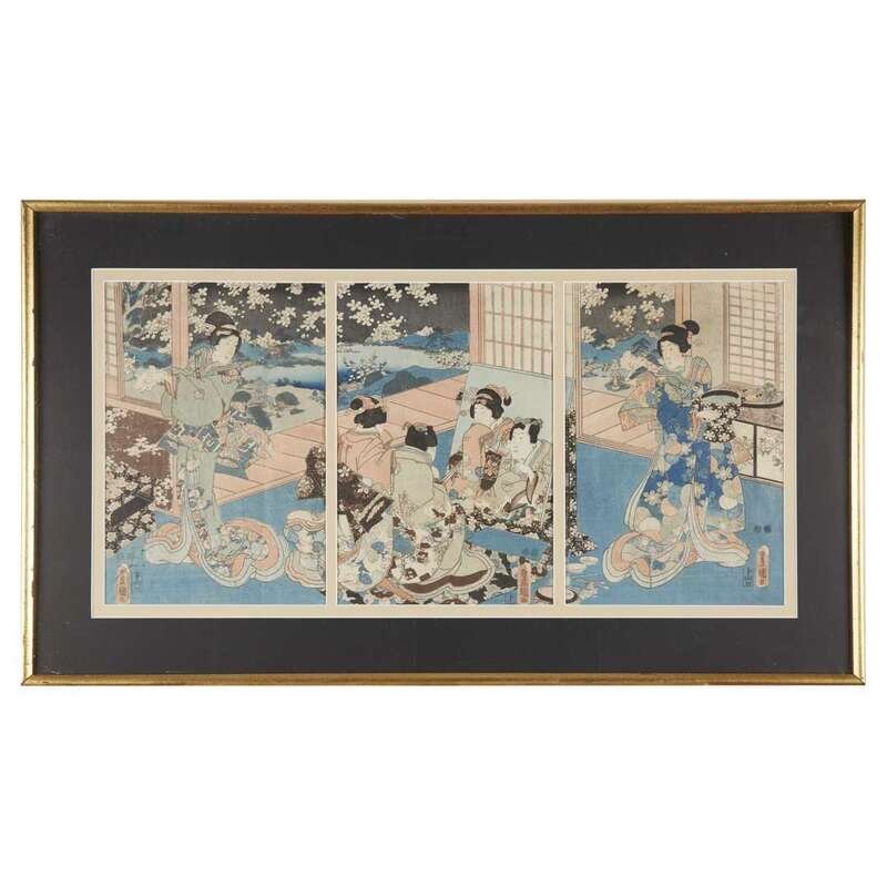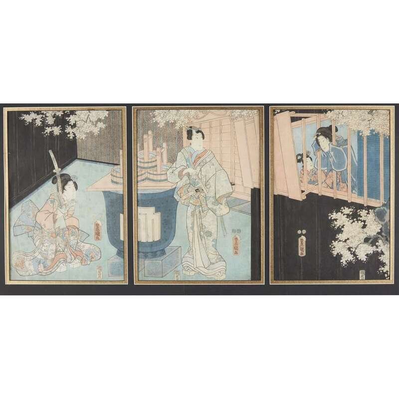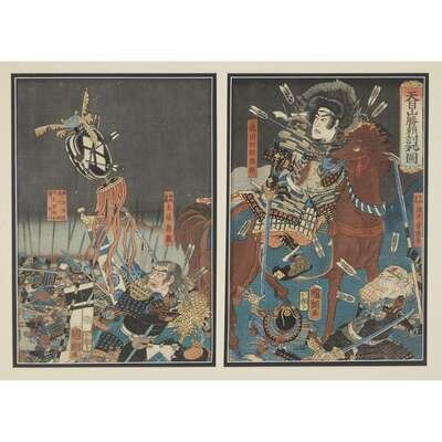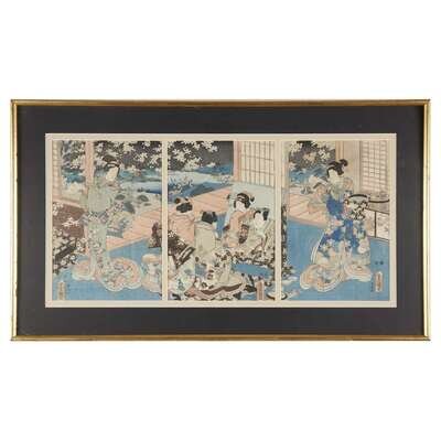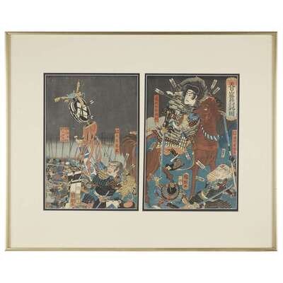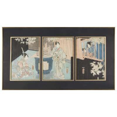 Comprising: a diptych, possibly by Kinateru, of a mounted Samurai in battle; a diptych, depicting five military figures; two triptychs by Kunisada, depicting a male figure by a cistern, three bijin looking on; the other of a couple gazing in a mirror with two female attendants; framed, matted, and glazed. Diptychs sight H: 13 1/2 in., 34.3cm; W: 19 3/4 in., 50.2cm; Triptychs sight H: 13 1/2 in., 34.3cm; W: 29 in., 73.6cm;