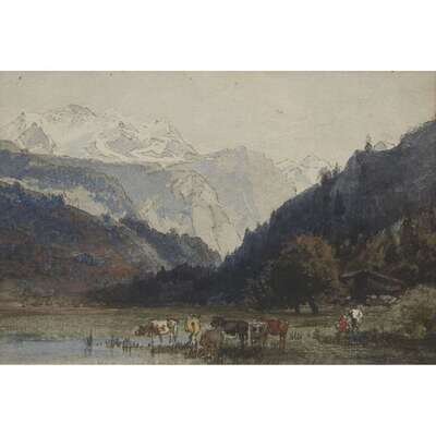 HERMANN HERZOG (AMERICAN/GERMAN 1832–1932) "COWS WATERING IN THE MOUNTAINS"