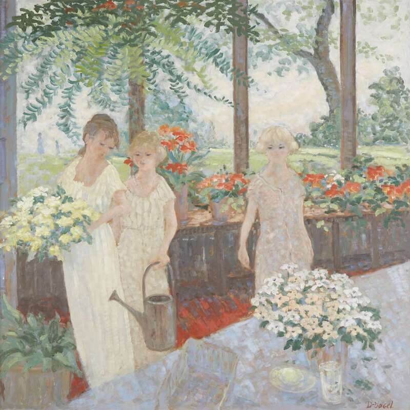DONALD STANLEY VOGEL (AMERICAN 1917-2004) ARRANGING FLOWERS IN THE GREENHOUSE